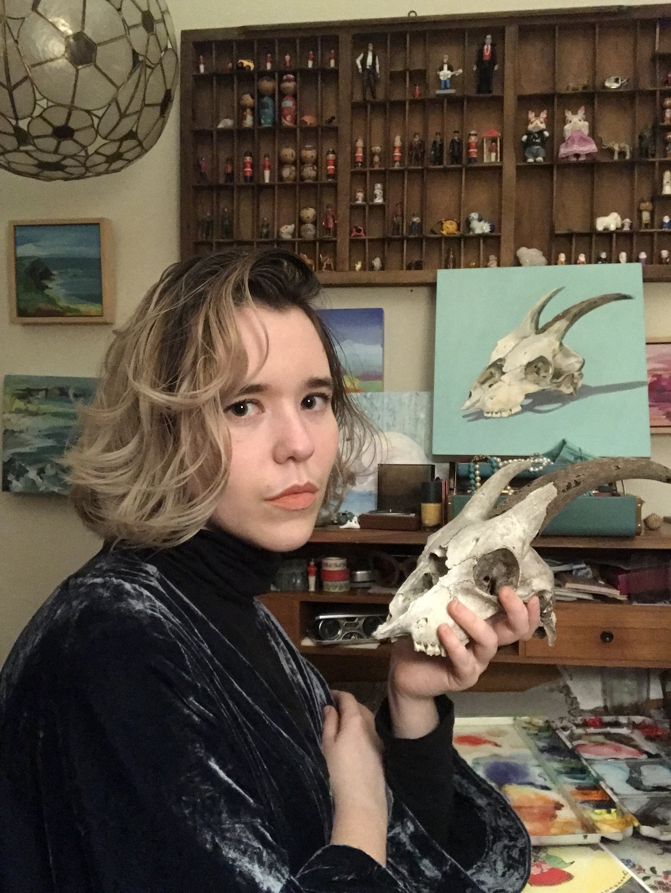 Julia Loopstra is a painter, illustrator, cartoonist, baker, wife, cat owner, picture framer, and collector of exquisite knickknacks. Originally from Santa Rosa, CA, she attended California College of the arts where she graduated with a BFA in illustration in 2017. When she graduated, she found a comfortable niche writing and drawing weekly webcomics, the longest running being her series Vampire Boyfriend which can still be found on Webtoons.